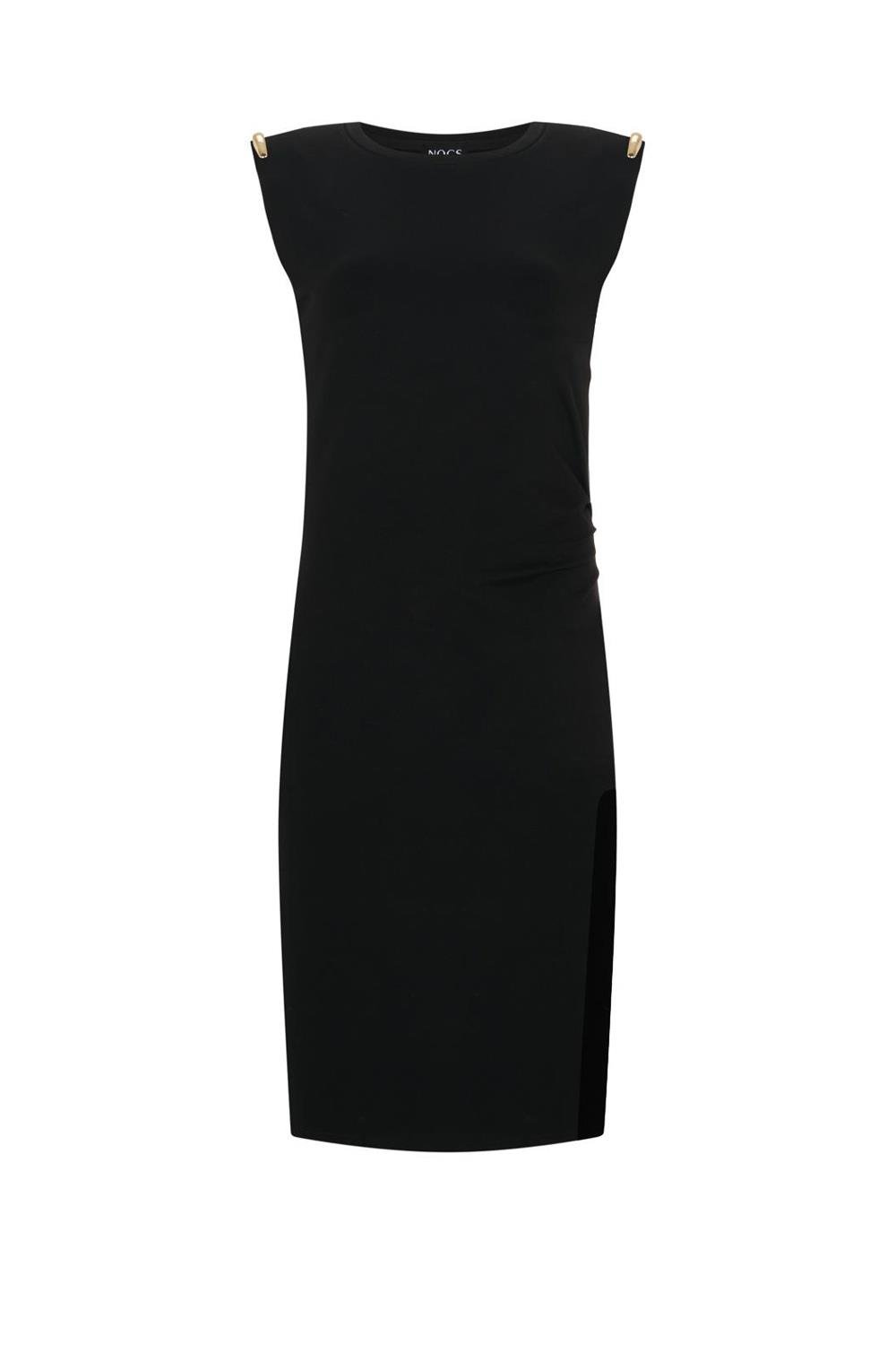 Açıklama : Omuzları vatkalı çıkarılabilir gold metal aksesuarlı sol yandan pile ve yırtmaç detaylı midi boy elbise