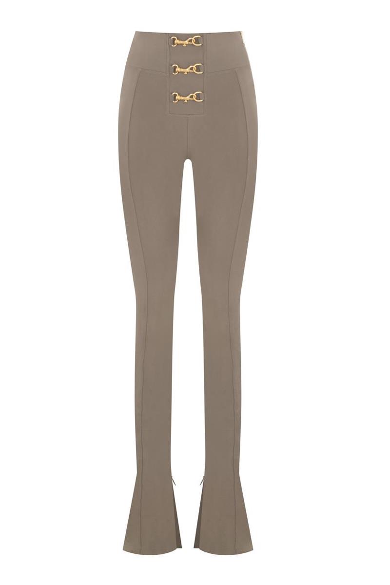 Açıklama: Metal gold aksesuar detaylı yandan açılır fermuarlı. Paça gizli fermuarlı yırtmaçlı licralı Flare paça Leggins